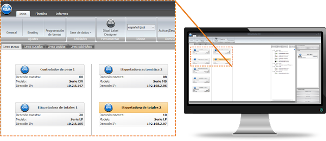 Versatile, visual, and easy to use tool. User friendly design and operation Quick visualization of all connected equipment. 2 possible views: tree diagram or tabs Real time control of the status of communications with the equipment through visual signals (green=connected/red=disconnected) to diagnose and prevent breakdowns in the installations Fast PC-equipment communications. Simultaneous communication with all connected equipment (multi-threading) Easy configurations. Configuration parameters can be saved in templates to be used in other equipment, avoiding errors Label designer. Direct access to Dibal DLD label designer (additional license required) Repetitive tasks management through “Scheduling task” function for its periodical activation Reporting. Configurable reports in tables and graphs that can be exported to different formats (PDF, excel, rtf, txt, etc.), and sent by email Time and cost-savings with remote maintenance. Equipment parameters can be adjusted in a secure and real time system, with no need of on-site assistance Notifications. The sending of emails with notices about the status of one or several actions can be configured