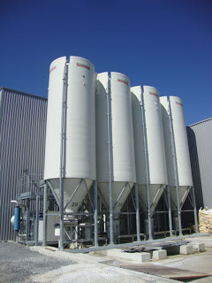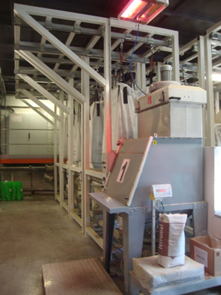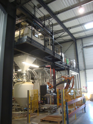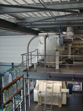 This installation is composed of 7 silos, 14 big bag unloading stations® and 5 premix hoppers. It produces 4000 tons/year. The primary products are stored in 7 polyester silos of 35 m3 each, located outside. The 14 big bag unloading stations are equipped with conveying screw feeders each equipped with non-return valve. All the screws are managed by only one variable speed drive. The overall is ground installed.