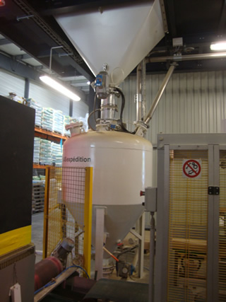 Different formulations are prepared to enter into the chosen recipe. A paddle mixer with double rotor assures a high quality mixing within a very short time. It is a low speed rotation type with an integral discharge. It allows obtaining homogeneous mixing. The mixed product is transferred either to the sacking station, or the bulk discharge station, or to the 5 premix hoppers. The obtained mixing is introduced by gravity into a blow tank and pneumatically transferred in dense phase, low velocity. This type of conveying minimises product dimixing. These premix mixings can also be introduced into the weighing hopper with additional ingredient for other recipes.
